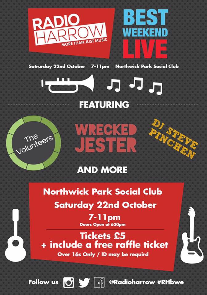 COME DOWN: Join us for ‘Best Weekend Live‘ – live music and entertainment from local bands and artists on Saturday night at the Northwick Park Social Club from 7pm-11pm on the 22nd Oct. Tickets are £5 on the door with all proceeds going to charity.