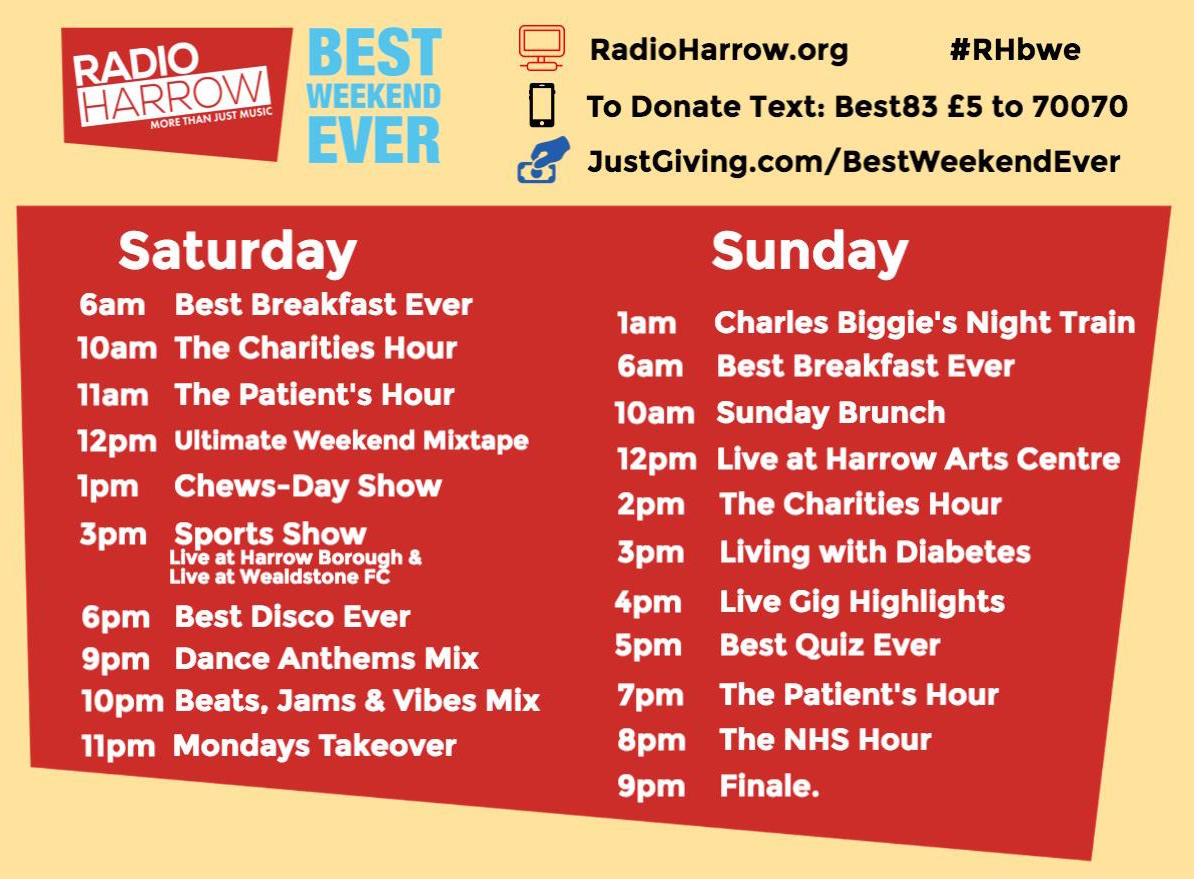 Highlights include a special Sports Show, two Charities Hours featuring interviews with local charities, a Treadmill Challenge from the Harrow Leisure Centre, a live music concert on Saturday evening, an outside broadcast from the Harrow Arts Centre on Sunday afternoon and much, much more. Take a look at the full schedule below.
